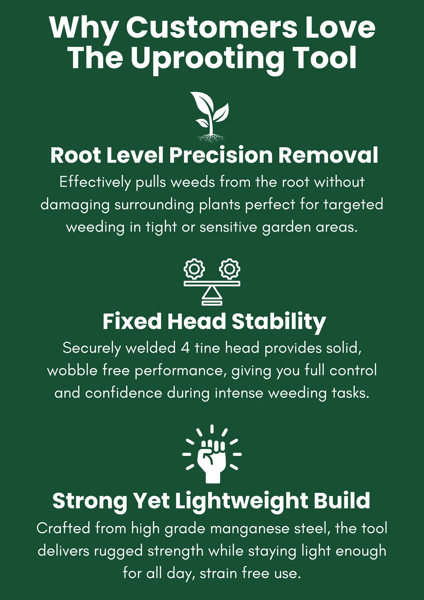 This Uprooting Tool is expertly engineered to penetrate deep into the soil, gripping roots tightly for full removal with minimal effort. Its sharp, angled tines ensure you can tackle stubborn weeds, break up compacted soil, and clear debris in tight spaces with ease. Whether you're removing dandelions or deep rooted thistles, this tool delivers root to tip extraction, leaving no weed behind.